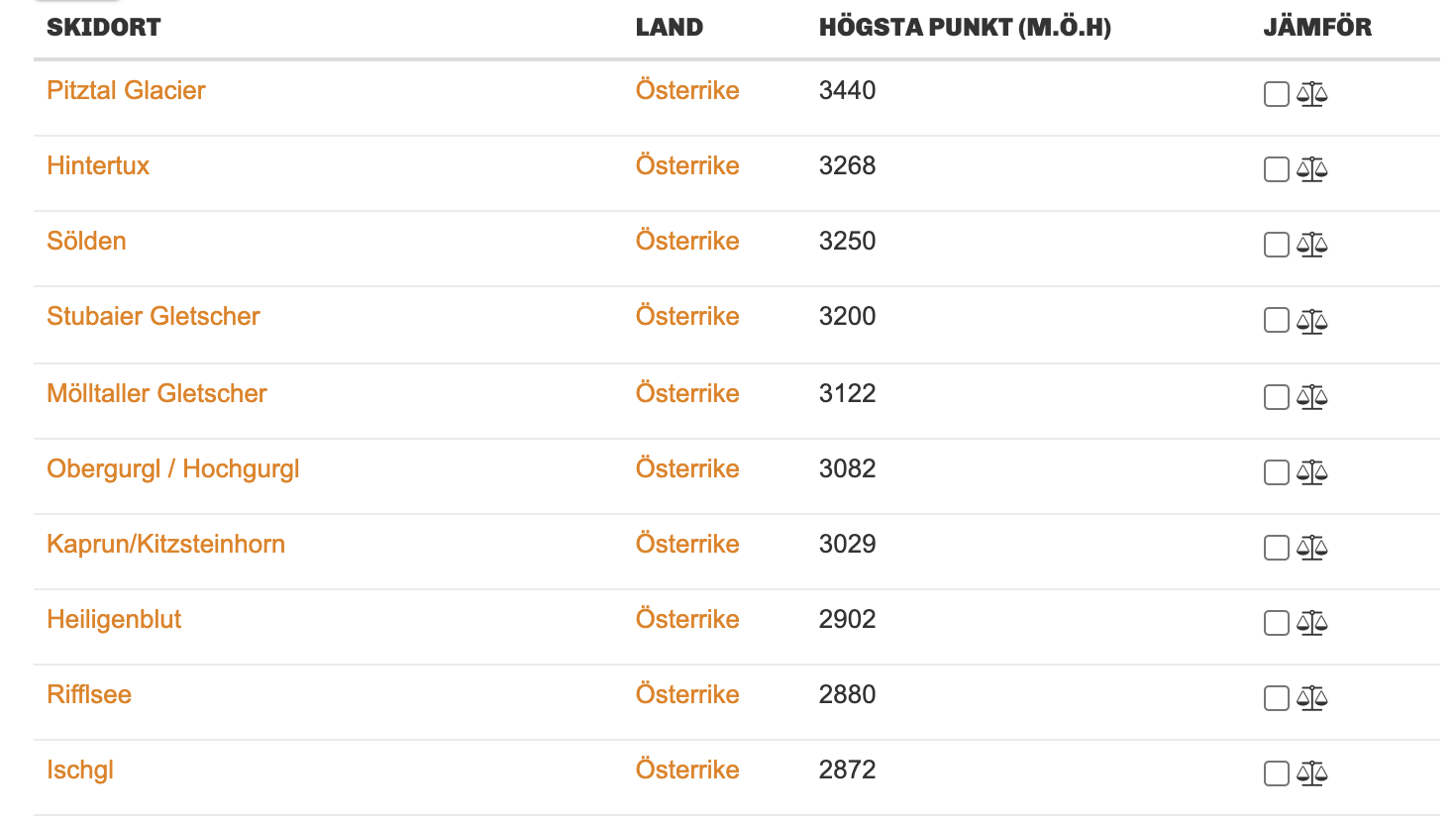 Dags att leta skidorter igen. Visste ni att Freeride.se har ett fantastiskt verktyg för att leta skidorter? Välj ”Skidorter” i huvudmenyn och gå in på ”Topplistor”, där kan ni sortera skidorter efter land, antal liftar, pistkilometer, högsta punkt, fallhöjd etc. etc….. vänta nu! ”Högsta punkt”, där har vi ju sökverktyget för höstskidresan!