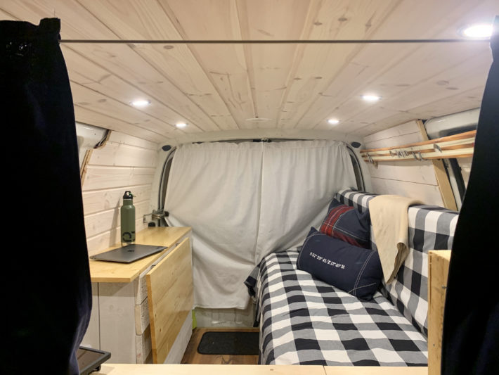 – Man får tänka lite längre när man tar fram kläder, elektronik eller mat, allt som används måste också läggas på plats direkt annars blir det väldigt stökigt väldigt fort. Att bo i en van har ändå visat sig betydligt enklare och smidigare än vad jag först hade föreställt mig. Även snöiga pjäxor och fuktiga skidkläder har sin plats.