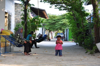 Guraidhoo hamn vid lokal båtens ankomst. I bakgrunden syns öns enda bil.