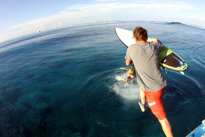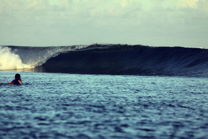 I hamnen på Malé ligger Dhoni efter Dhoni på rad – typiskt indiska båtarna med tak. Båtsmännen väntar på att en rimlig offert från hustlande besökare som vill på utfärd. Surfare och dykare omvartannat. Bara en halvtimmes färd från hamnen ligger Jailbreaks, en klassisk surfspot över en botten av död korall och vatten med trettio meters sikt. Ekosystemet är intakt, mitt ute i ingenstans. Verkligen overkligt i sin verkliga betydelse. Som att det inte finns på riktigt. Kroppen vänjer sig fort. Det är mindre jobb med paddlingen när vågorna bryter i en revpassage. Take off-zon, våg, kanal ut igen.