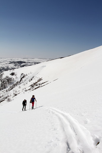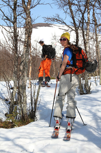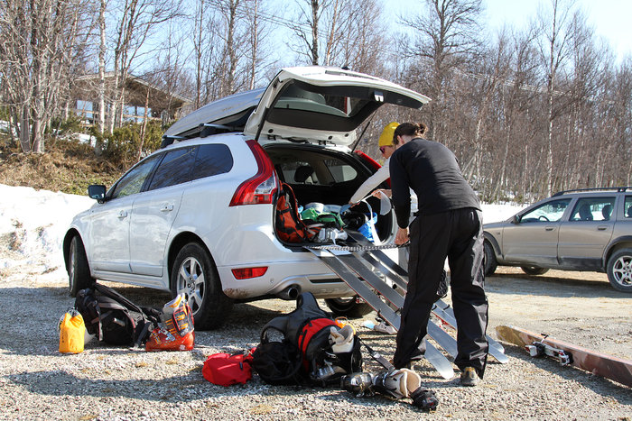 Denna gång var planerna att vara miljövänliga och gå upp för berget för egen maskin. Målet var Helags och vi var taggade på att göra flera toppturer där. Men, påsken i år var sen och vädret slog om till svensk sommar (som sagt +11 grader). Så när solen förvandlade skoterleden till mjuk sörja blev det stopp för transporterna ut till Helags. Så miljövänliga var vi att vi skulle ta skotern ut till berget.