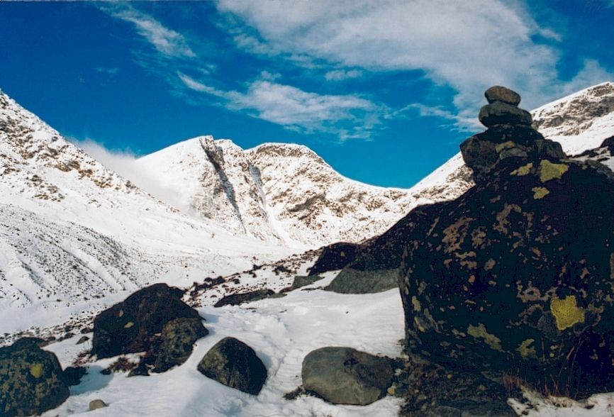 Kebne i början av oktober 2002. På väg upp överraskades vi av en snöstorm (noll sikt) så vi fick avbryta och traska till tälten igen :'(