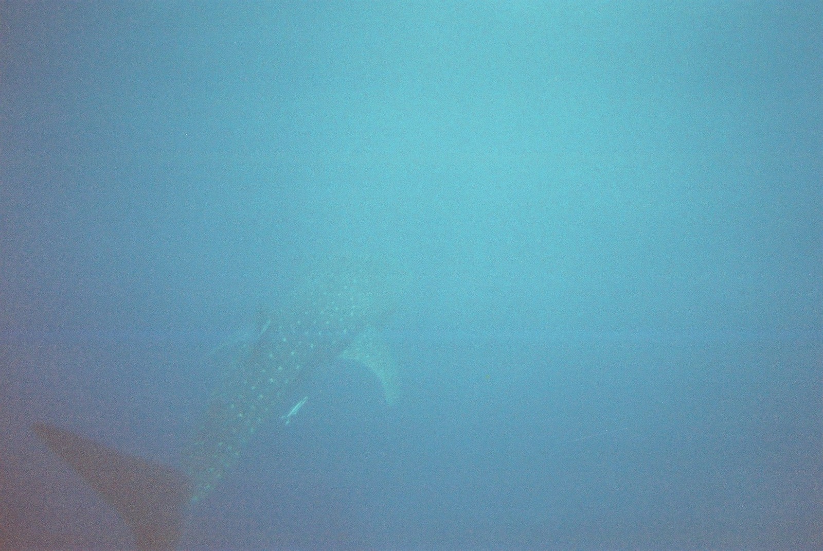 Det här är den största fisk jag någonsin skådat verkligheten och det var så häftigt! Tyvärr var kameran jag använde inte den bästa men om man tittar noga så ser man... Den här valhajen räknas som liten, ändå var den 7-8 meter. På sidan av den simmade fiskar som såg jättesmå ut men i själva verket var de mellan 1-2 meter.. Wiiie tänkte jag när jag såg den! Och så simmade jag efter så länge som jag orkade och tills att båten såg ut som en liten prick..