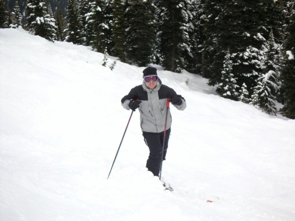 Tar en paus i puderåkningen i The Glades på Harmony Ridge på Whistler Mountain