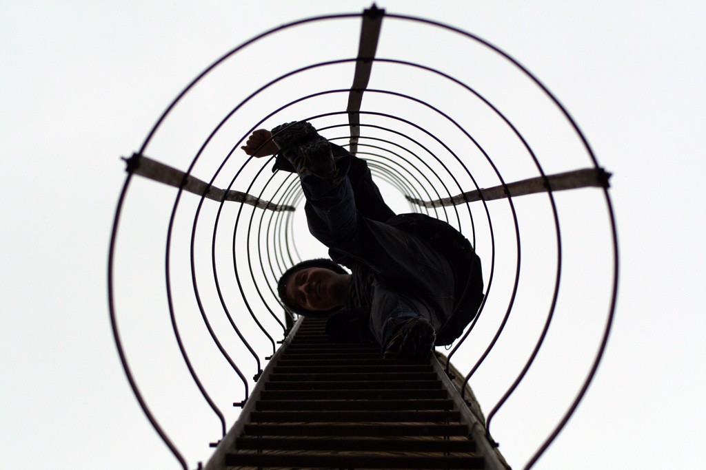 Jesper bestämmer sig för att klättra upp i en skorssten.