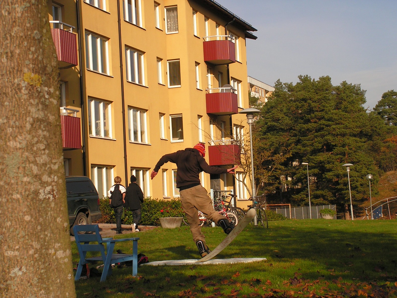 Snowboardabstinensen blir för stor ibland, då duger vad som helst, t o m en ursliten madrass på en gräsmatta.