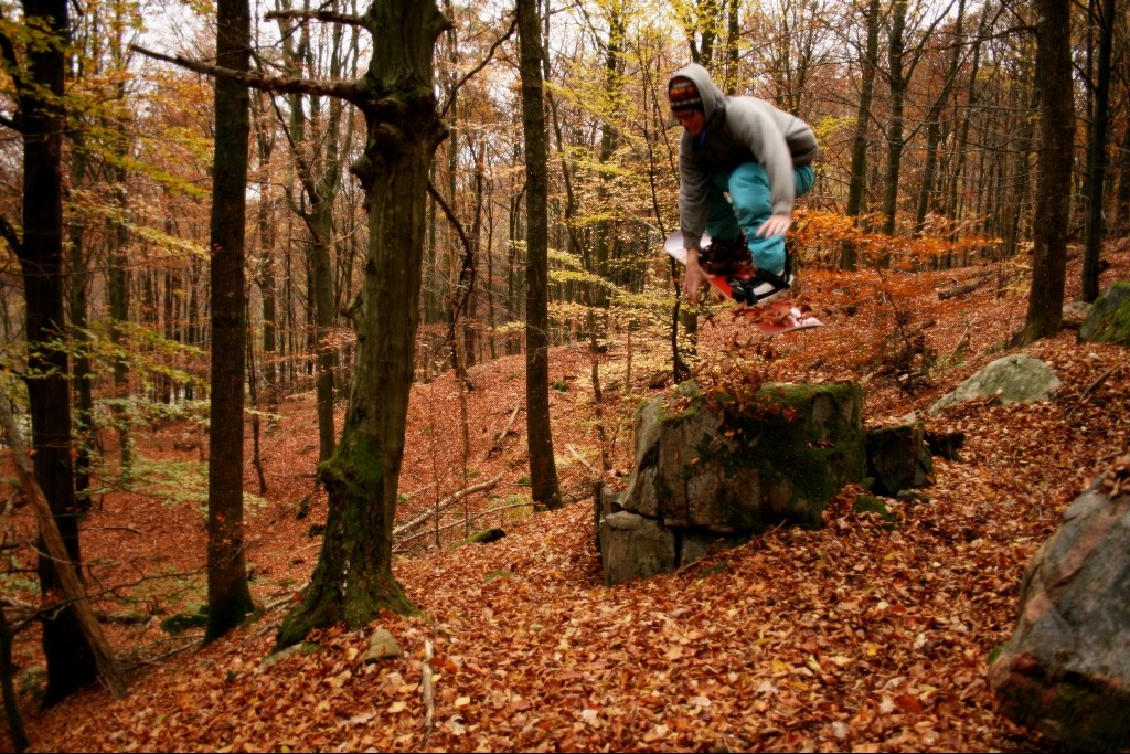 Markus droppar en sten ner i löven. Har man inte snö får man nöja sig med det man har.