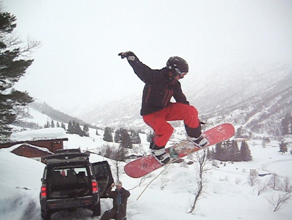 Bild tagen från ett videoklipp, därav den kassa kvalitén. En dag då liftarna var stängda roade vi oss med att hoppa över en väg...
