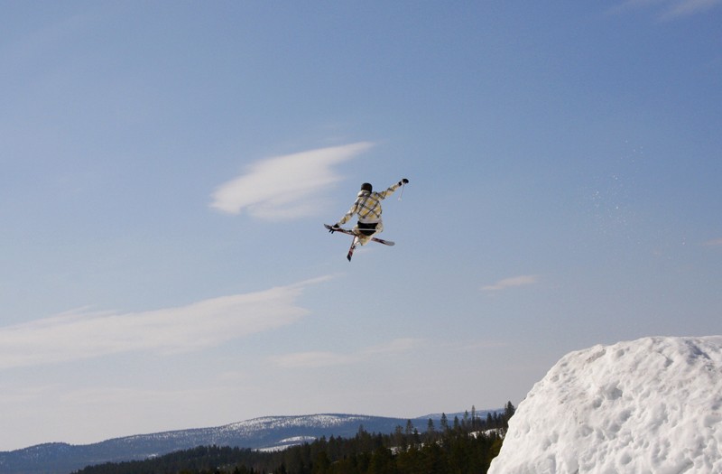 En härlig bild på Martin Franklin som försvinner i fjärran i ett av sina finalhopp i Kåbdalis springsession. Bilden innehåller mycket luft och säger en hel del om det härliga 20-meters hopp han byggt för ändamålet. Ett bra arrangemang vad jag förstod av tillfrågade åkare. Tyvärr räckte det inte till pallen för Martin men vad gör väl det en sådan härlig dag.