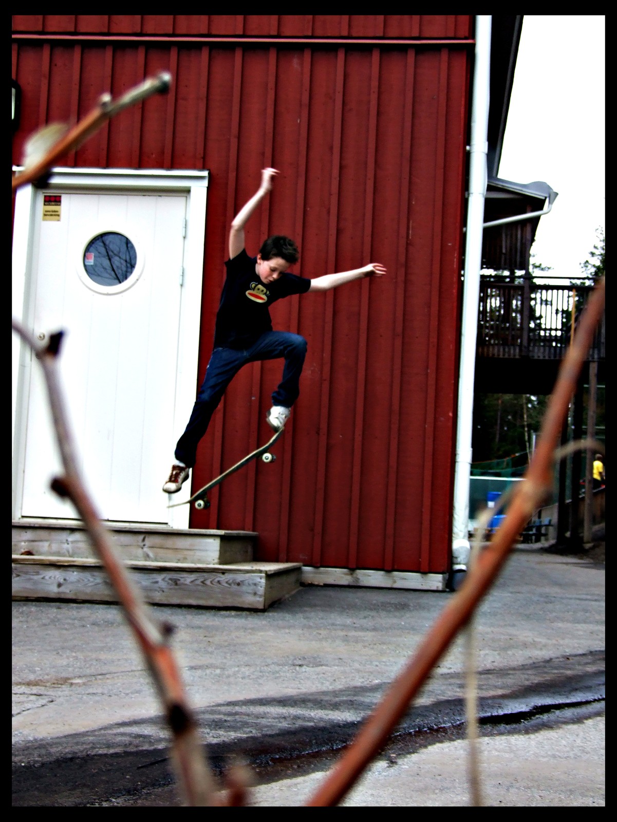 mikael kör olie ner från en trappa