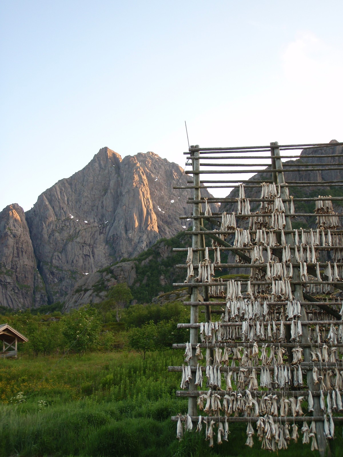 Klockan är 2 på natten och det är omöjligt att sova. Jag går en tur med fiskespöt efter en lång dags klättring. Solen börjar gå upp över bergstopparna vid Kalle camping. Det som hänger på ställningen är torkad långa.
