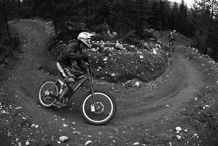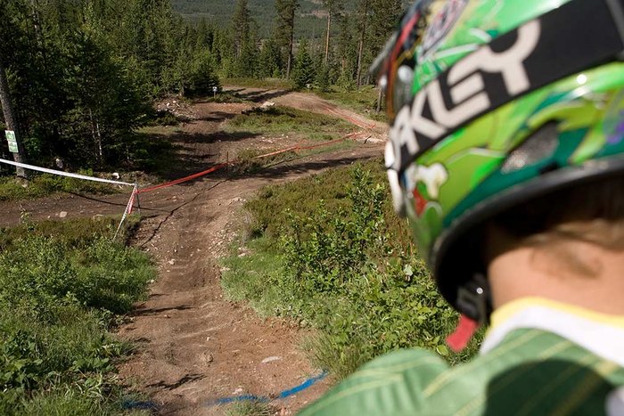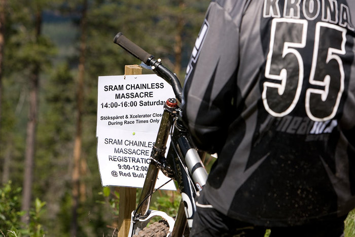 På grund av regnet flyttades tävlingen från lördagen till söndagen så att banan hade en chans att torka upp. Utan kedjor och möjligheten att trampa begav sig de cirka 25 tävlande nerför berget på tider knappt under två minuter. Jag frågade Herman varför man inte har kedja?