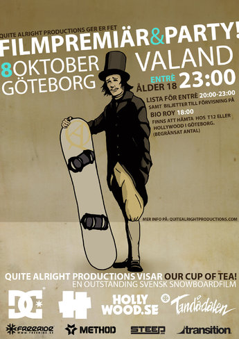 Nu är det dags för första snowboardfilms-premiären i Sverige och först ut är svenska Quite Alright Productions. Imorgon den 8 oktober har deras nya film Our Cup Of Tea premiär i Göteborg.