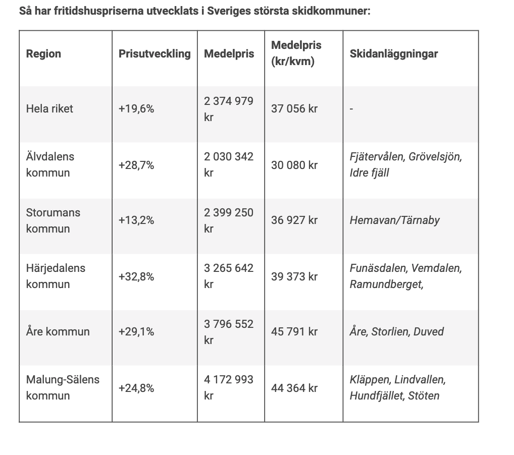 Priserna på fjällstugor har ökat dramatiskt det senaste året. Störst har uppgången varit i Härjedalens kommun, där Funäsdalen, Vemdalen och Ramundberget ligger, upp 33 procent. Malung-Sälen är dock Sveriges klart dyraste skidkommun, med ett snittpris på 4,2 miljoner kronor.