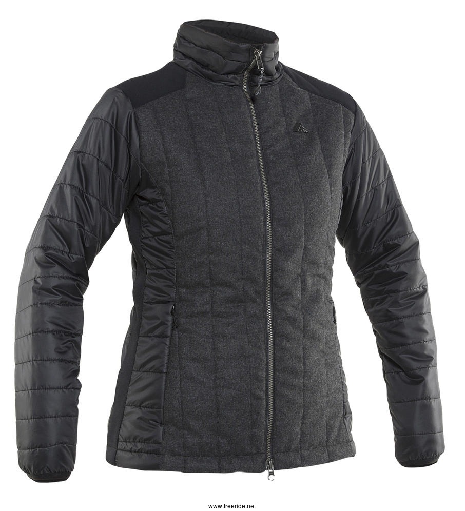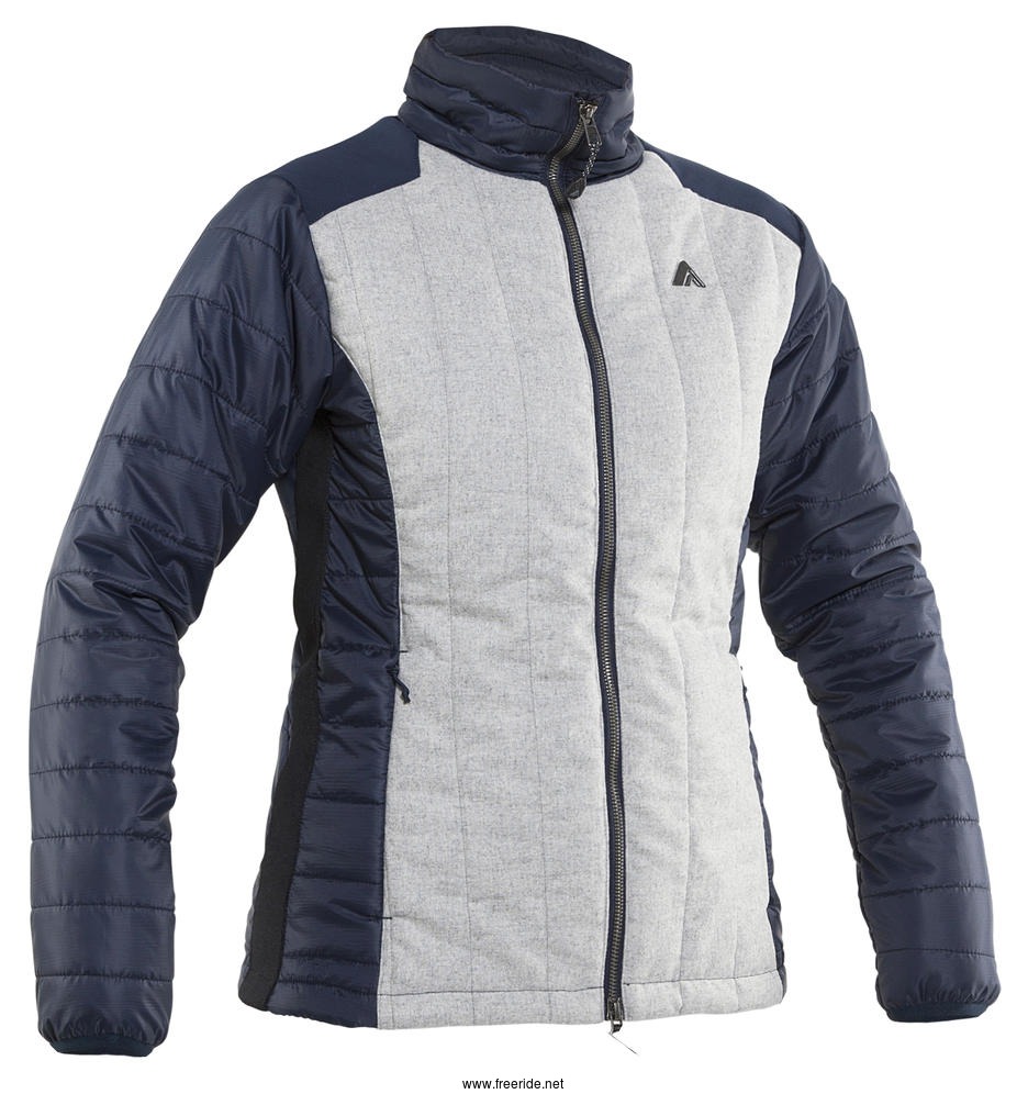 Funktionellt och feminint lager-2-plagg som fungerar fint både som solitär eller under skaljackan. Kombination av olika material med ullparti framtill, kviltade partier och stickade band i sidorna. Vindtät och vattenavvisande, andasfunktion. Skön, lätt vaddering med mjuk dunkänsla. 2 ytterfickor. Diskret metall-logo på bröstet.