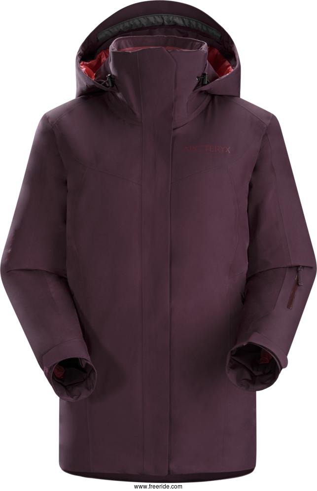 Waterproof, down insulated jacket for cold days skiing and snowboarding in resort.