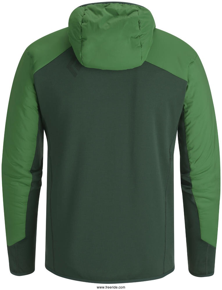 [Hood, chest and arms] Schoeller® stretch-woven nylon with NanoSphere® Technology (80 g/m2, 93% nylon, 7% elastane), [Insulation] PrimaLoft® Silver Hi-Loft (80 g/ m2); [Underarms, back and cuffs] Blended merino wool (300 g/m2, 100% nylon face, 100% merino wool back)