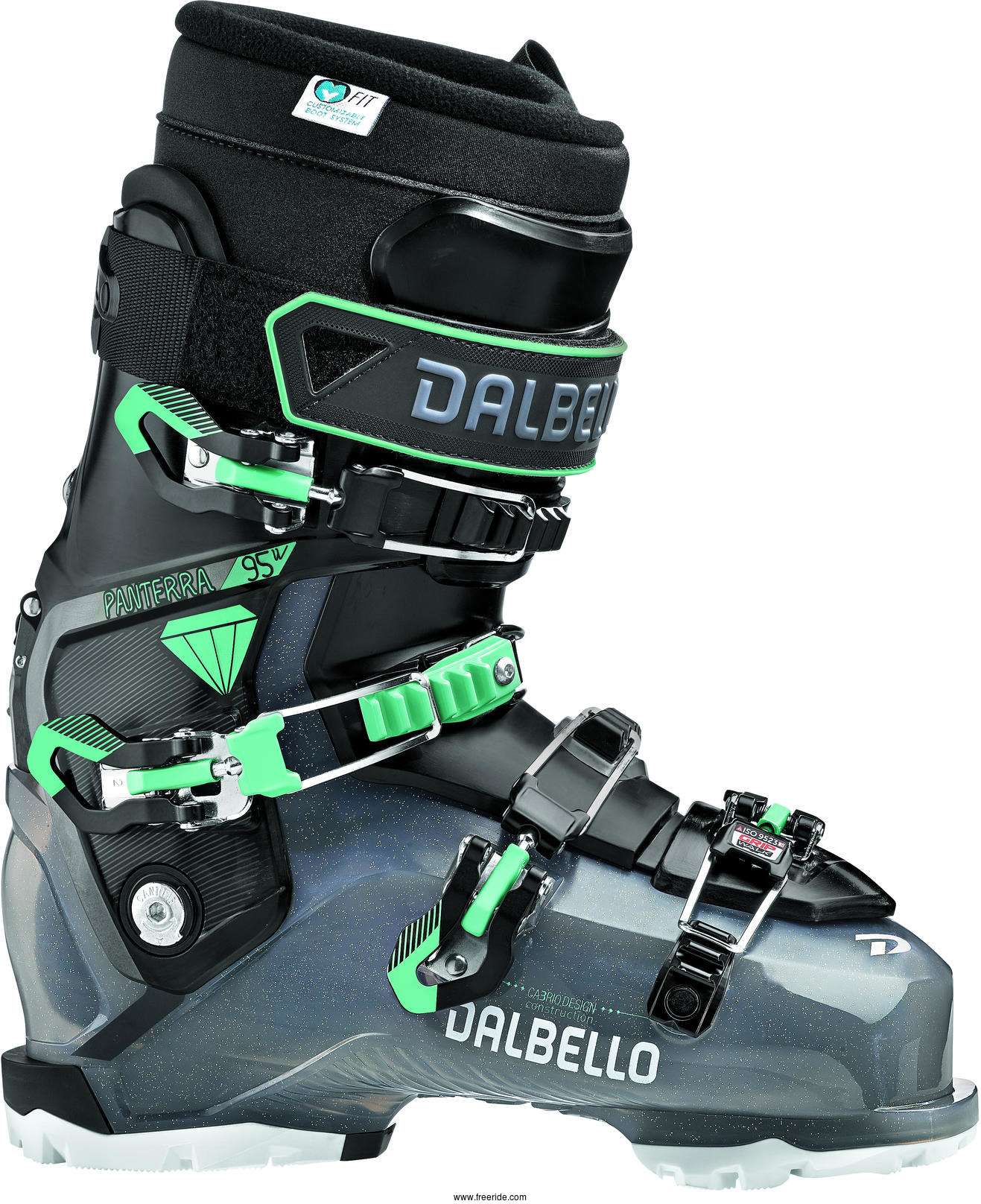 Nya Panterra W-serien ersätter gamla Kyra. Gjutformarna är helt nya och såklart helt anpassade efter en anatomi som passar kvinnors fötter och vader. Kvar är den väldigt uppskattade passformen från Kyra om 101 mm läst, men gåläget har utvecklats och är nu på hela 50 grader har mindre friktion än tidigare. Hälgreppet är tightare än tidigare och insteget mer öppet för lättare in- och ursteg. Vikten har sänkts genom att använda "Power Cage" teknologi där partierna för att kraftöverföring förstärkts och onödig massa skalats av. Panterra 105 W ID finns för de starkaste tjejerna med krav på kraftöverföring och hårdare flex. Kommer med ID Now innersko i 100% Ultralon med medium/soft densitet. Irfran plast och s.k. laser behandling av ytskiktet. Förmonterade med GripWalk sulor, alpin-norm sulor medföljer. Dalbello har jobbat hårt för att sänka vikten, trots alla förbättringar, och hamnar på endast 1600 g! Lästvidd (VVF): 99-101 mm, Flex 95-105