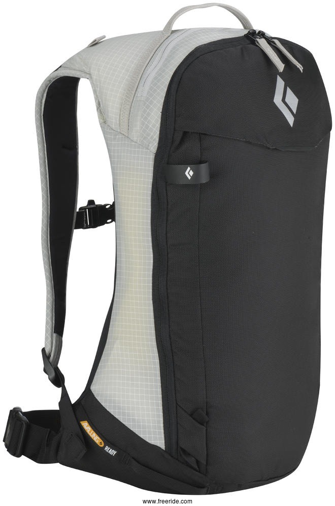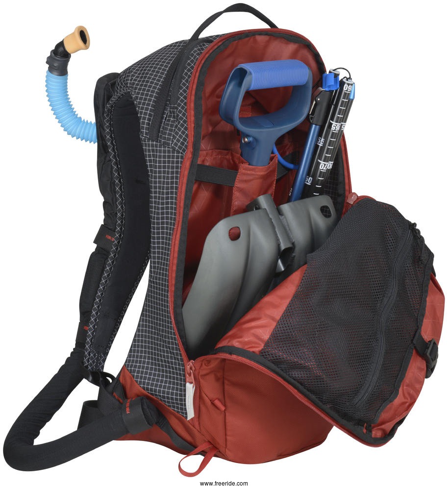 > Single ice-axe attachment points, Hi-Lo helmet holder and internal avy tools organization