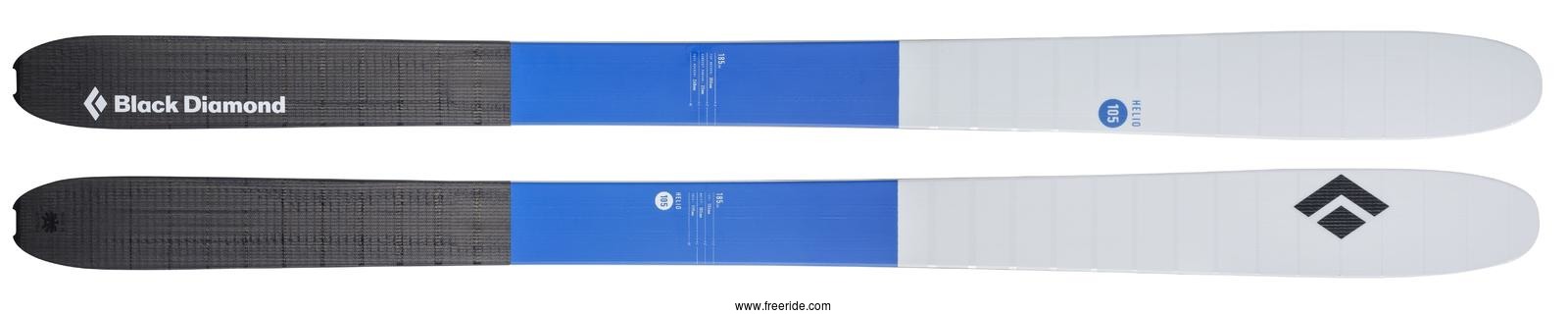 Our ultralight ski for dawn-to-dusk missions and technical descents in soft conditions, the Black Diamond Helio 105 ski balances playful, soft-snow performance with technical precision. The Helio’s pre-preg carbon fiber layup makes it incredibly light for big vert days and technical ascents, while maintaining a smooth flex and torsional stiffness for reliable, responsive skiing on the way down. Early rise in the tip and tail improves flotation and trail-breaking efficiency, and an ABS tail protector also has an integrated skin-clip tab to keep your skins from sliding off.