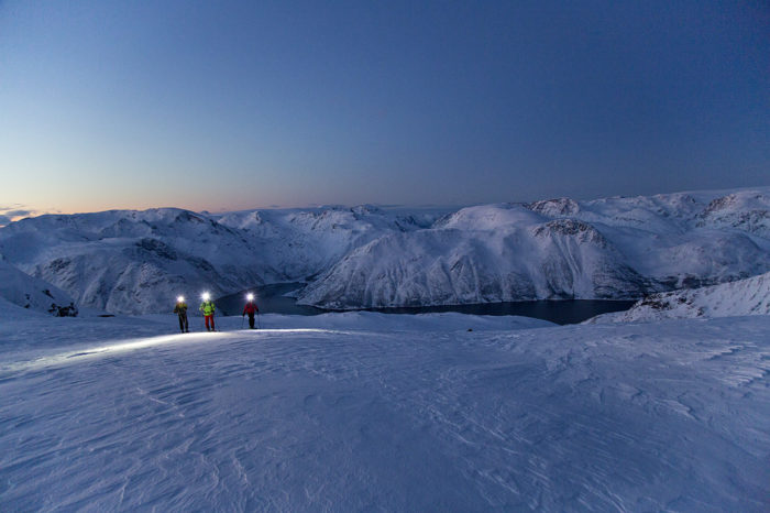 På nedre Tverrelvtind ligger en lång, brant couloir och väntar på oss. Det var den som offpistbonden Tore Karlstrøm pratade om. Men det får bli korridorklättring en annan dag. Det är Vassnestind som är målet nu. En topp som är ökänd enligt både offpistbonden Tore och lampmakaren Bjarte Hollevik – väderutsatt och som regel bara har hård snö kvar att åka på, men samtidigt känd för utsikten mot fjordarna, havet och de dramatiska Trolltindstopparna. Ju längre upp på fjället mot Vassnestid 897 meter över havet som vi kommer, desto mer hänförande blir vyerna. Det är ett bergslandskap svårt att stirra sig mätt på. Och idag har vi tid att njuta. Vi gör några skidåk. Äter matsäck. Dricker termoskaffe. Allt i maklig takt. Planen är att spendera kvällen på berget i hopp om att träffa Altas omtalade Aurora Borealis – naturfenomenet som får turister över hela världen att vallfärda hit.