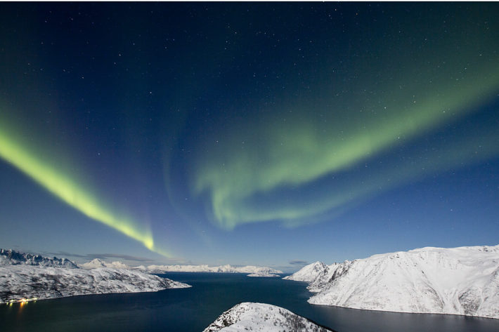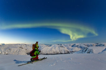 Solen sjunker ned bakom Trolltindane. Ljuset blir mjukt och lyfter det vintriga mörkblåvita fjord- och bergslandskapet från vackert till överjordiskt. När de sista strålarna försvinner sätter vi på oss pannlampor, men släcker dem lika fort igen när flera av ”molnen” som hänger på himlen börjar glöda svagt gröna. Molnen är inga moln, det är ett annat betydligt ovanligare naturfenomen. Medan mörkret tar över syns norrskenet allt tydligare. Det böjer sig som en stor regnbåge i grönt, glider över i rosaröda-toner och andra schatteringar. På de stora, öppna vita snöfälten nedanför Vassnestind påbörjar vi till sist vår vår nedfärd under norrskenet.