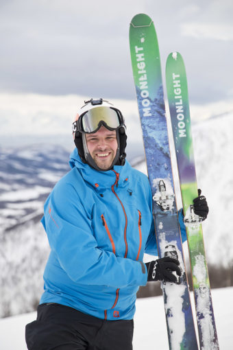 Han plockar ut ett par skidor ur sin bil och ber mig hålla dem. I handen får jag en prototyp av en kommande skidmodell från märket Moonlight skiis. De är ungefär lika tunga som en baguette, jämfört med mina egna skidor och bindningar är det ungefär tre kilo som jag slipper att släpa upp för berget.