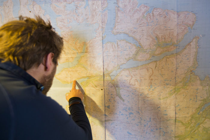 Just idag kan Tore Karlstrøm inte åka med oss, han ska hålla lavinkurs för en grupp med lokala norrmän från Øksfjord som nyligen insett vilka fantastiska möjligheter de har att åka skidor på bergen rätt bakom sina hus. Tore Karlstrøm hinner dock berätta om några av hans favoritturer i området: Koppartindsmassivet för den fina snön och skidåkningen, rännan på Nedre Tverrelvtind för adrenalinet och Vassnestind längst ut i nordväst för den enorma fjord- och havsutsikten. Men likväl som det finns möjligheter i bergen lurar det också faror. Vi pratar om den aktuella lavinrisken, Tore förklarar vilka berg och sluttningar som vi bör vara extra försiktiga med. Sedan pekar han rakt bakom oss: