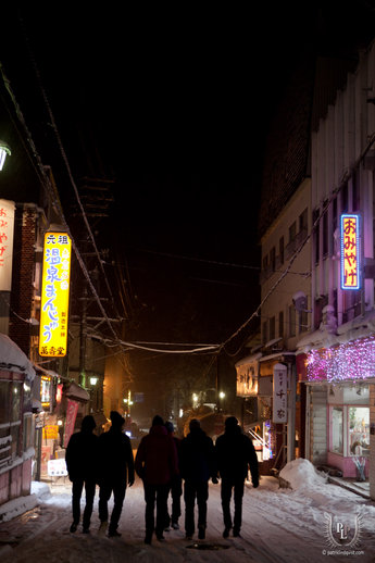 Myokos huvudgata by night. Ett gäng hungriga svenskar strosar genom staden på jakt efter någonting att äta.