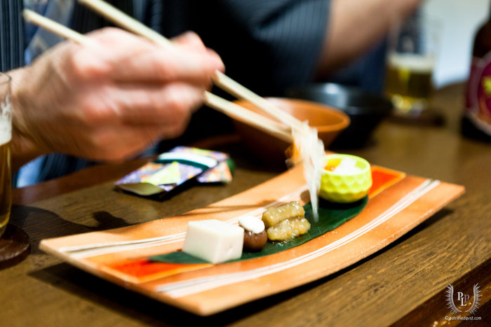 prydnadssaker och ovanför köket hänger menyn i form av träbitar med utsnidade japanska tecken. Det känns lite som vi har blivit inbjudna till en japansk familjs vardagsrum. Här serveras rykande het udon, ett slags nudlar gjorda på vete som knådas, rullas ut och skärs i långa remsor. Detta serveras i runda träskålar med en soppa smaksatt med mirin (en söt sake) tillsammans med diverse tillbehör som fisk, räkor, kött och grönsaker.