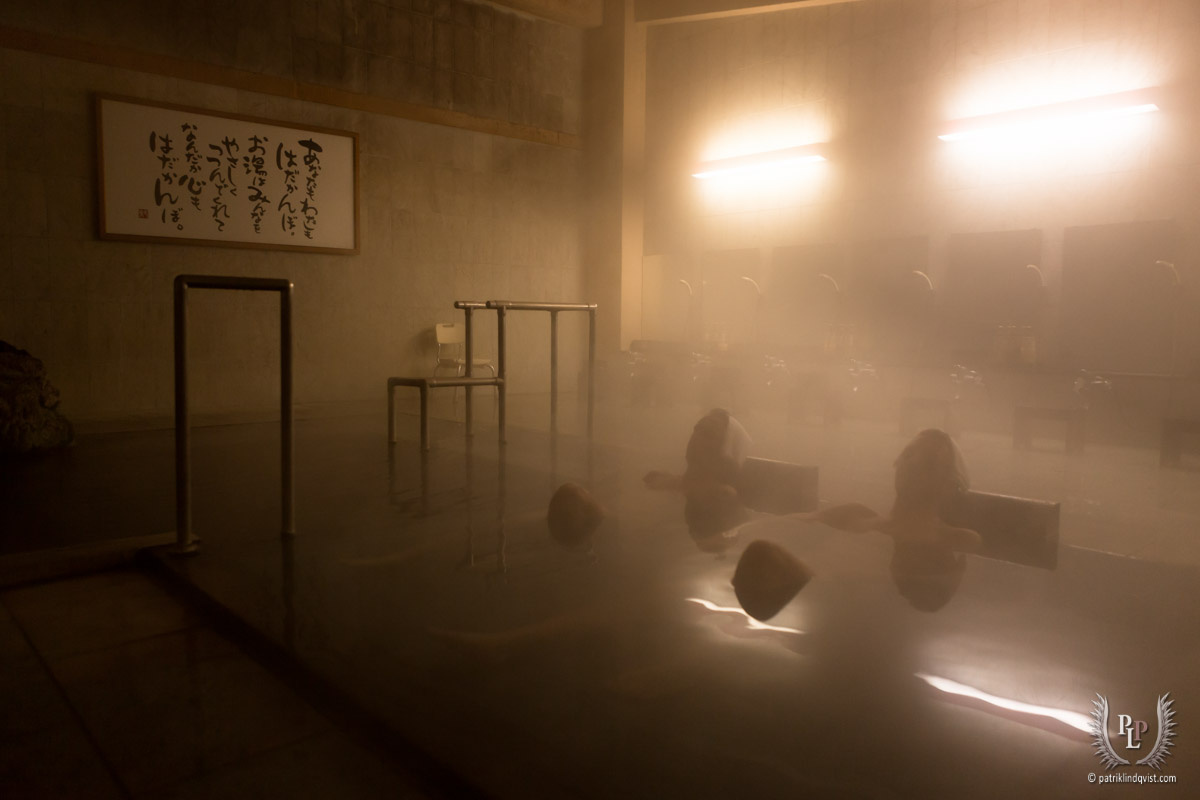 handduk. De två ingångarna är dolda av ett rött respektive blått draperi med japanska tecken. Hmm, vilken kan vara herrarnas? Vi tvekar en kort stund innan en äldre man kommer ut från det blå draperiet. Tofflorna ställs prydligt på rad medan kläder och den stora handduken läggs i en korg. Endast med den lilla handduken går vi nakna in till herrarnas bad. Här sätter vi oss på små pallar, tvålar in och sköljer av oss. Den lilla handduken används till att skrubba kroppen ren, vilket japanerna är noga med. Rekommendationen är sedan att gå i badet stegvis så att kroppen vänjer sig.