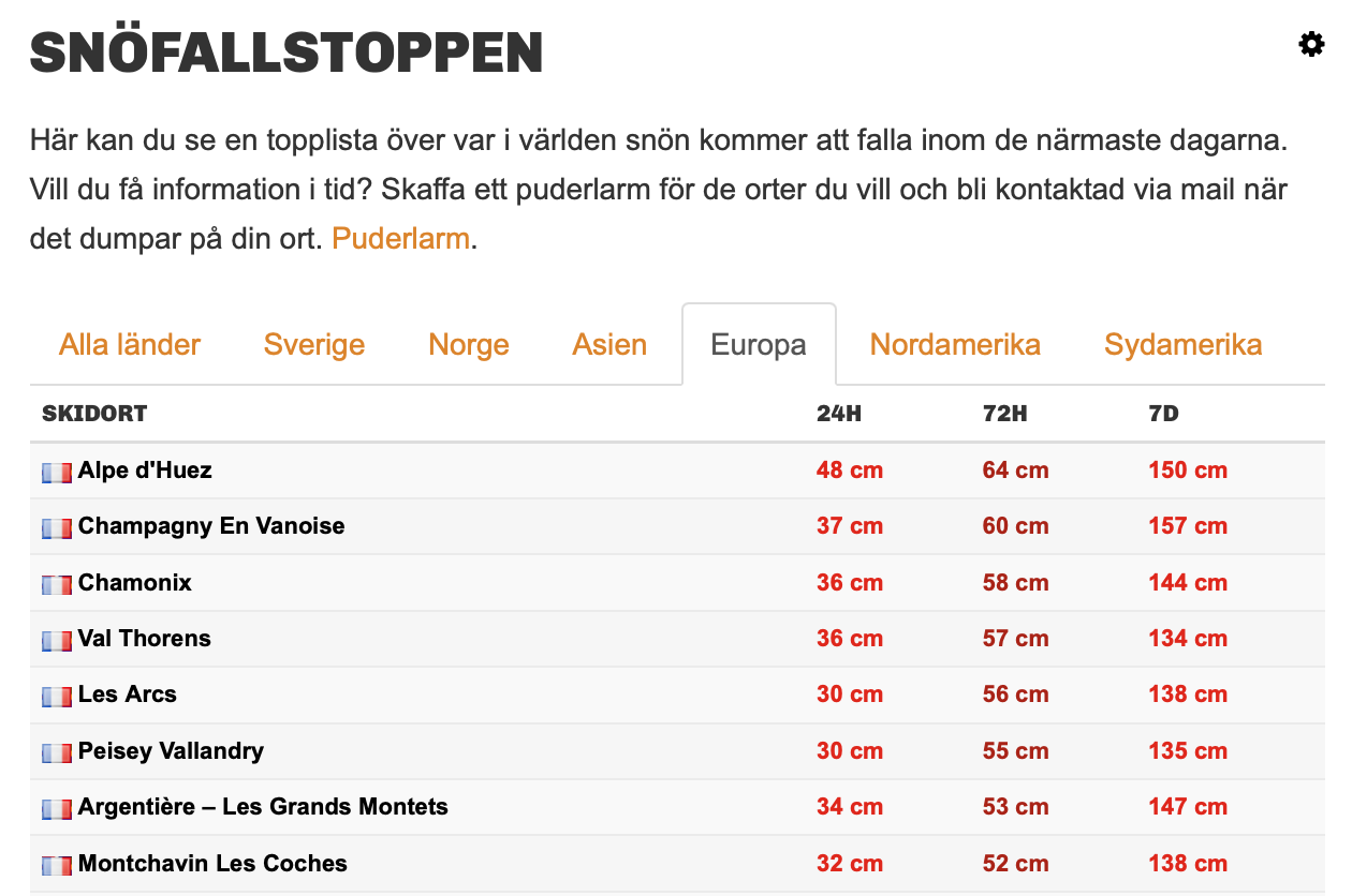 I Åre har det första riktiga puderdumpet kommit och nu är uppenbarligen snön påväg mot Alperna också. I Frankrike beräknas det komma över en och en halv meter snö under den kommande veckan och på ett dygn ska det falla upp emot en halv meter i exempelvis Alpe d’Huez.