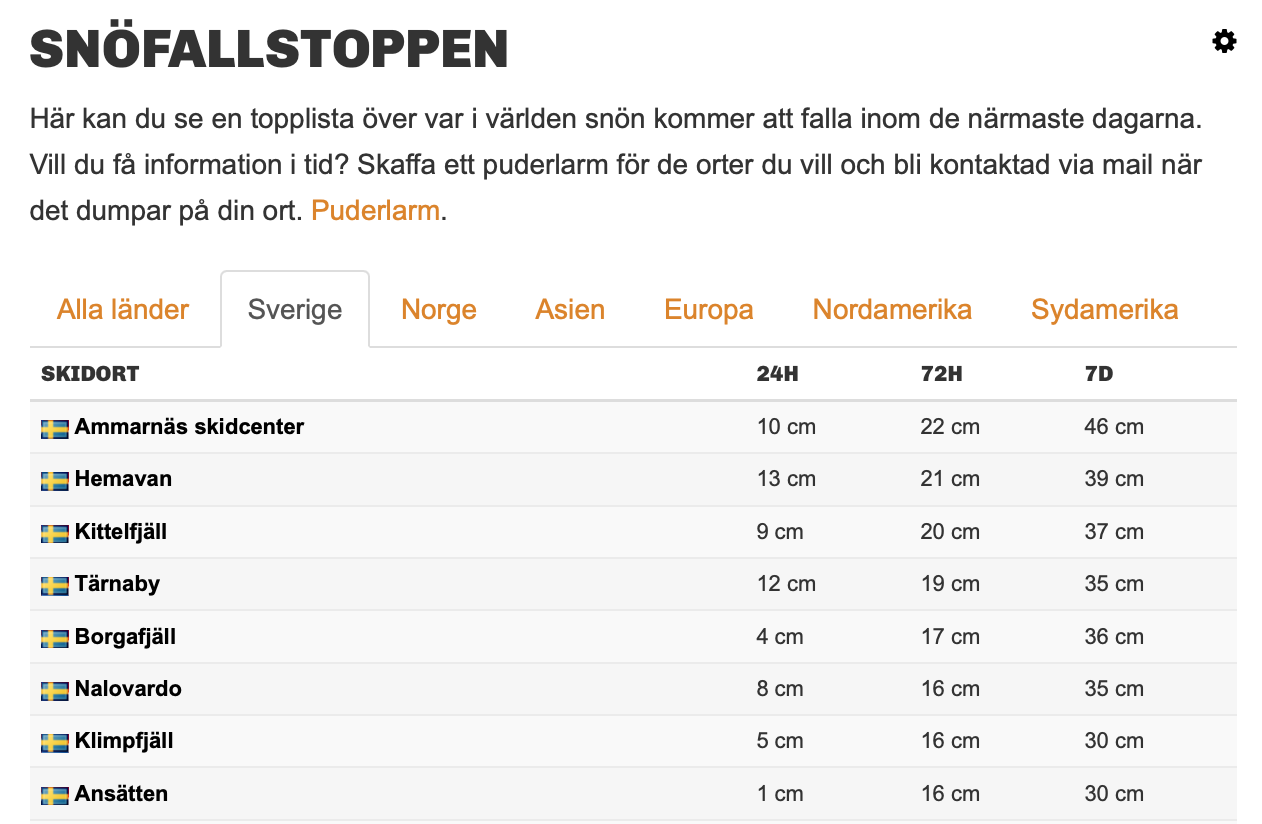 Läs mer om vilka skidorter som beräknas få mest snö och ställ din egna puderlarm på Snöfallstoppen.