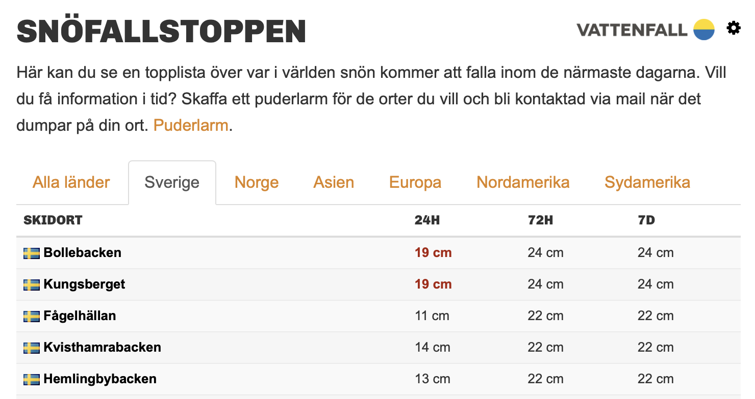 Läs mer om vilka skidorter som beräknas få mest snö och ställ din egna puderlarm på Snöfallstoppen som nu sponsras av Vattenfall som står för ett gediget intresse för väder, snö och hållbar skidåkning.