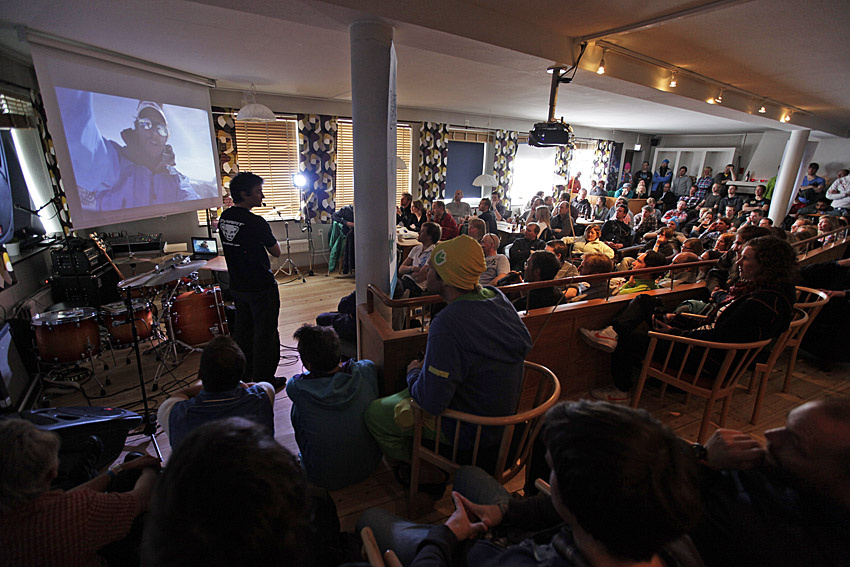 Runt klockan åtta på torsdagkvällen samlas alla i storstugan då jag, Camilla Antonsson (ansvarig för PureFreeride Camp, reds anm) hälsar alla välkomna, berättar lite om campen, presenterar partners och kör lite utlottningar. Därefter blir det intressanta och inspirerande föreläsningar av bland andra Patrik Nordin, Mikael af Ekenstam och bergsguiden Andreas Bengtsson.