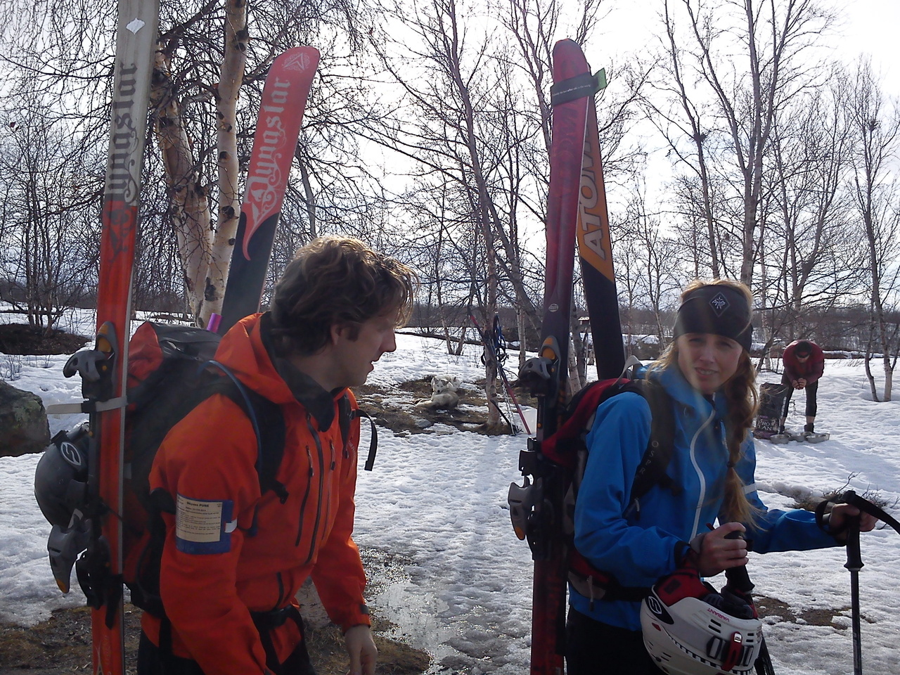 På lördagmorgonen åkte nio topptursgrupper iväg och det snöar lite ute. Vid halv tio tar jag mitt kaffe i restaurangen och känner att snart ska jag också bege mig iväg till backen. Jag testar pjäxor och skidor som Patrik Nordin på Dynafit lånat ut till mig. Äntligen, upp på Nuolja och känna snön under skidorna en stund.