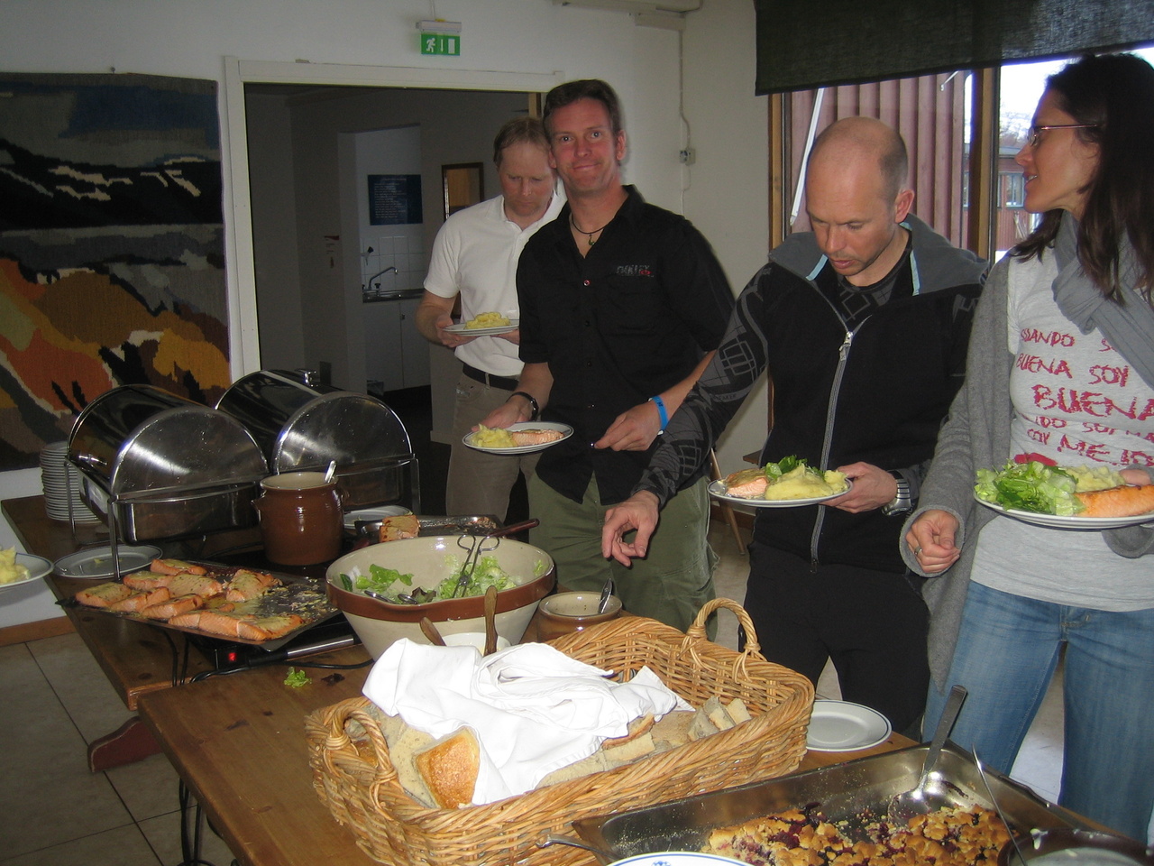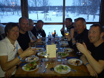 Klockan sju fylls storstugan till sista plats, då ska nämligen ski-touring legenden Greg Hill från Canada berätta för oss om sin fantastiska bedrift, 2 Million feet in 365 days. En otrolig story berättas av en mycket ödmjuk, seriös och härlig person. Greg Hill fick oss alla att fascineras av hans äventyr och av hans enorma kapacitet. Drygt en timme senare efter Gregs otroliga berättelse beger vi oss alla mot restaurangen till kvällens grillbuffé. Stämningen är på topp, avslappnad, skön men samtidigt full med fart och efter buffén så tar BALBOAS över och vi får alla en jättekul kväll tillsammans.