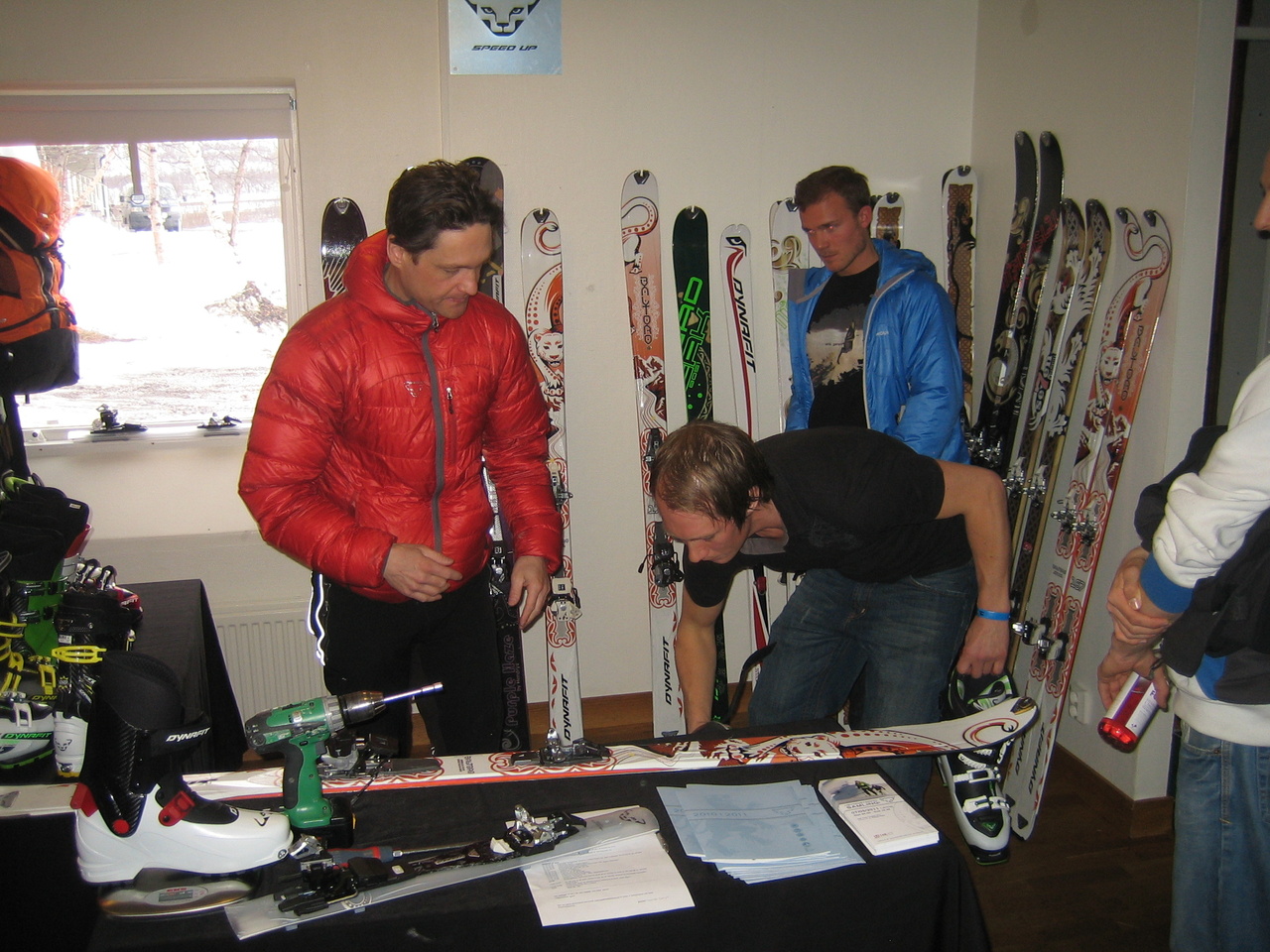 Vid fem på eftermiddagen är de flesta tillbaka på turiststationen, glada, lite trötta men fantastiskt nöjda med dagens prestation. Testcentret är öppet och deltagarna beger sig dit för att lämna tillbaka och testa nytt. Campinfon är öppen och vi tar emot nya anmälningar inför lördagens aktiviteter. Det visar sig att vi får ihop nio topptursgrupper till lördagen och vi har nu också några deltagare som vill gå med på fotokursen, isklättra samt följa med på offpistguidningen och lavinkursen.