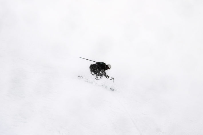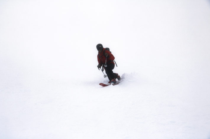 Dimman har nu dragit in och flera decimeter före detta puder, nu lika blöt som en lördagkväll på Folven, resulterar i minimalt glid och en sikt som knappt når ned till skidspetsarna. I ärlighetens namn är förhållandena faktiskt katastrofala, det är så klistrigt före att det knappt går att ta sig ned: