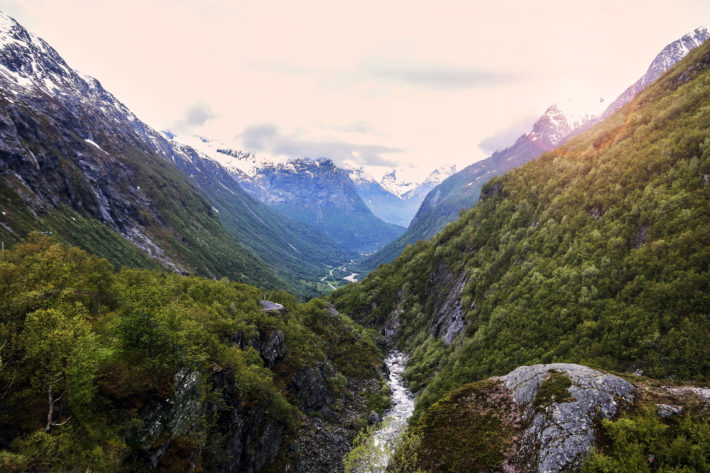 Klockan är sent slagen när vi rullar igenom tunnlarna på fjället som ska ta oss till Hjelledalen och slutdestinationen Stryn, och det är med nöd och näppe som vi över huvudtaget kommer fram. Den nätta resan på cirka hundra mil avslutas med snöstorm, tillika minimal sikt och sommardäcken försöker gång på gång placera oss i snödrivorna längs den vindpinade vägen. Som tur är stöter vi på en generös plogbilschaufför som kan leda oss fram i ovädret och tids nog checkar vi som planerat in på Folven Adventure Camp i Stryn.