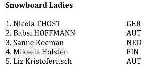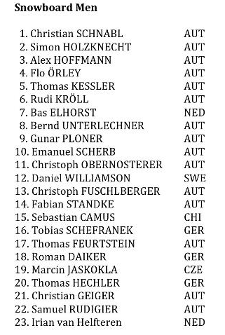 Flera av snowboardåkarna körde fina trick från klipporna, vilket i ungefär 50% av fallen resulterade i krascher, eller åtminstone rejäla “butt checks”. Efter diverse poängavdrag stod till sist österrikaren Christian Schnabl som segrare i snowboardklassen. Schnabl tävlar på Freeride World Tour, och har tidigare vunnit bland annat Nendaz Freeride 2011.
