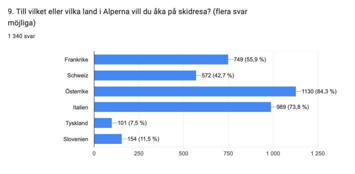 Detta är en undersökning som vi genomför årligen och intresset för att åka till Alperna högt. 84,3 procent väljer dessutom helst Österrike vilket är högre än förra året (82,1 procent). Nedan dyker vi ner i några utvalda delar av svaren.