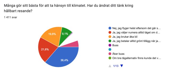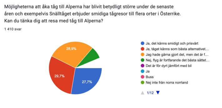 Hållbart resande är likt fjolårets undersökning fortfarande en het fråga och det är fullt möjligt att åka direkttåg ned till Alperna. 36,4 procent flyger dock hellre eftersom det går snabbare men över 21,6 procent svarar att de väljer tåget om det är möjligt. Nästan 60 procent svarar att de kan tänka sig att ta tåget till Alperna. Nästan 30 procent svarar att de hellre stannar i Sverige med hänsyn till klimatet.