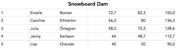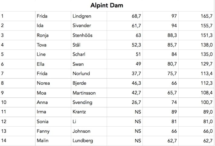 I damer alpint åker Sonia Li iväg först, och drar självsäkra super G-svängar nedför den branta bergsidan i sin första friåkningstävling någonsin. Ronja Stenhöös droppar isfallet stort, Ida Sivander lägger en 360 på en sprättig klippa längst ned och Frida Lindgren kör på som en tok.
