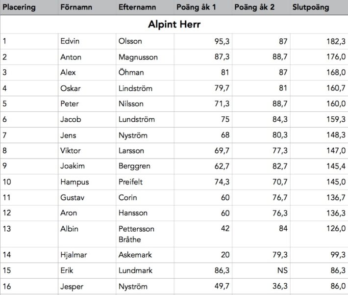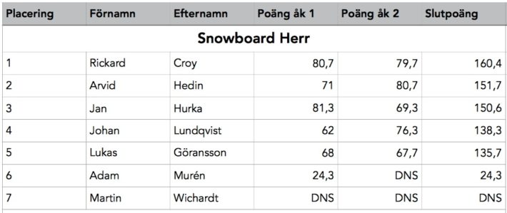 Trots ofördelaktiga snöförhållanden är nivån på åkningen hög. Klippor stompas, vindpinad snö slaktas och poäng delas ut. Alla hejar på alla. Ingen åkare startar utan jubel från sina medtävlande, och ingen kommer heller i mål utan en stor applåd. Vi får se några läskiga krascher, där Filip Berggrens volter utför centralklippan är den allra mest hårresande. De allra flesta kommer i mål helt förfärade över underlaget. Alla utom Edvin Olsson, aka Mr Prince Charming från Frösön, han är leende som alltid: