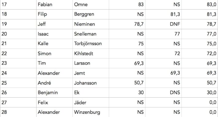 I herrklassen skidor öppnar Felix Jäder upp en ny linje. Som inspirerad av Marcus Eder kör han in på en stor klippa underifrån och droppar den sen ned i fallinjen, följt av en elva ner till målet. Senare tar Fabian Omne och Erik Lundmark efter, och kör två av dagens fräsigaste åk. Den där klippan tillhörde dock det rödmarkerade och stängda området på facet, och efter en stunds diskussion i domarbåset fick de inga poäng. Peter Nilsson och Anton Magnusson hoppar riktigt stort båda två och Edvin Olsson ställer ned ytterligare ett stabilt åk. Jeff Nieminen står får dagens krasch, efter en transfer längst ned i facet. Han hoppade långt och högt, landade lite väl platt och låg kvar lite väl länge. Han var omtumlad men klarade sig utan skador.