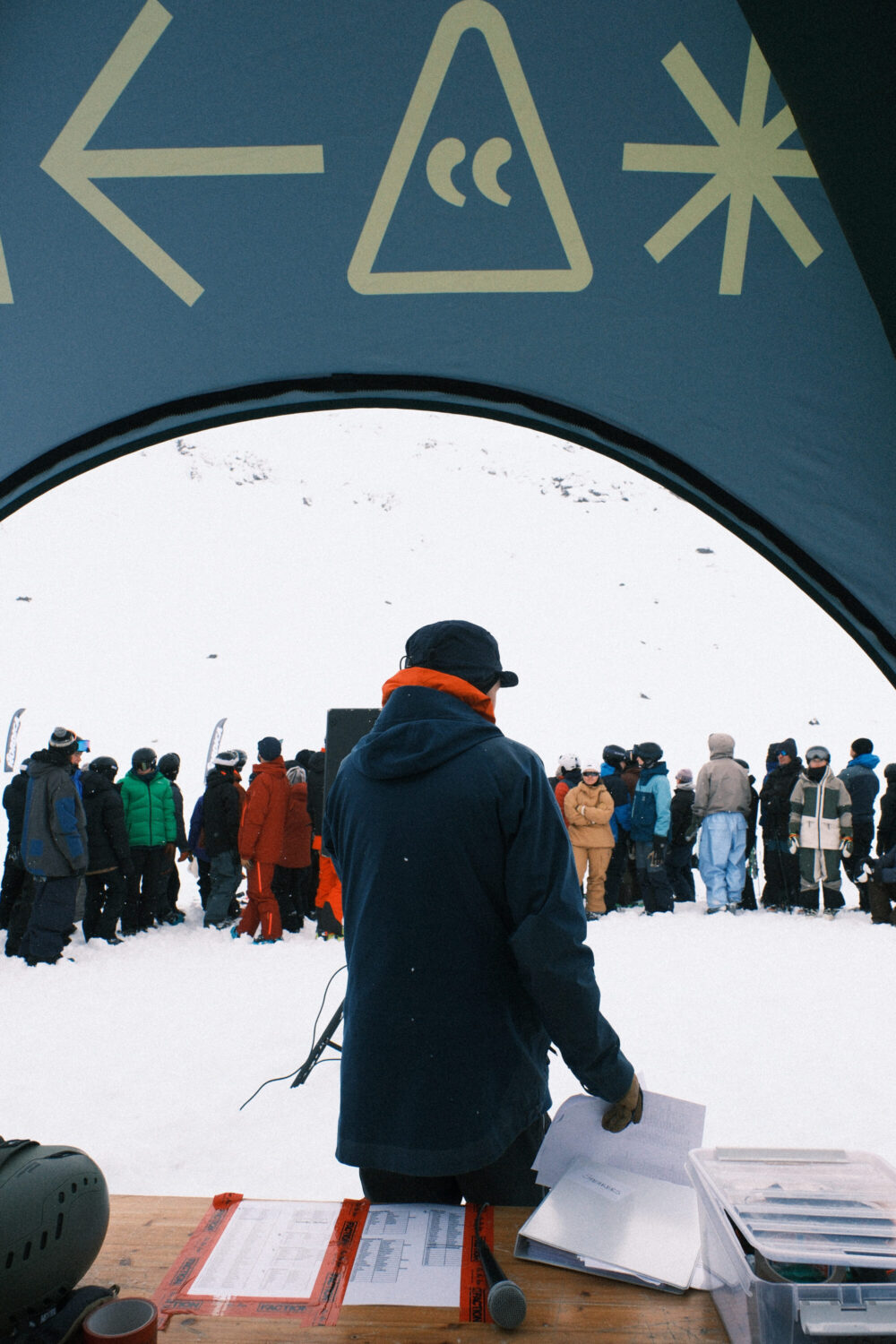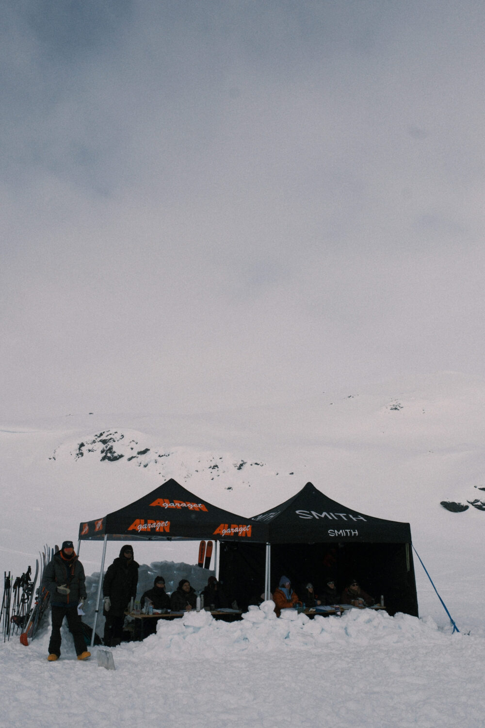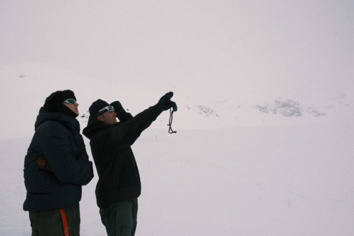 Försöken för att få till en tävling dag 3 blir många och långt gångna. Prognosen visar stark vind och eventuell nederbörd – men det är en sol där bakom molnet i symbolerna i SMHI:s tabell. Kombinerat med ett riktigt peppat gäng deltagare som säger sig vara villiga att lida lite för att få åka ett andra åk gör att alla alternativ utforskas. Planen är att köra åkare i pistmaskin med hytt upp till målområdet i startordning, ha ett kortare åk och låta domarna sitta inne i samma maskin. När Johan af Ekenstam kommer ned från sin morgontur upp på fjället konstateras att det inte kommer funka. Det drevar såpass att marken inte riktigt syns. Förfrysningsrisken är extrem i den hårda vinden och Johan höll dessutom knappt på att hitta ned från fjället.