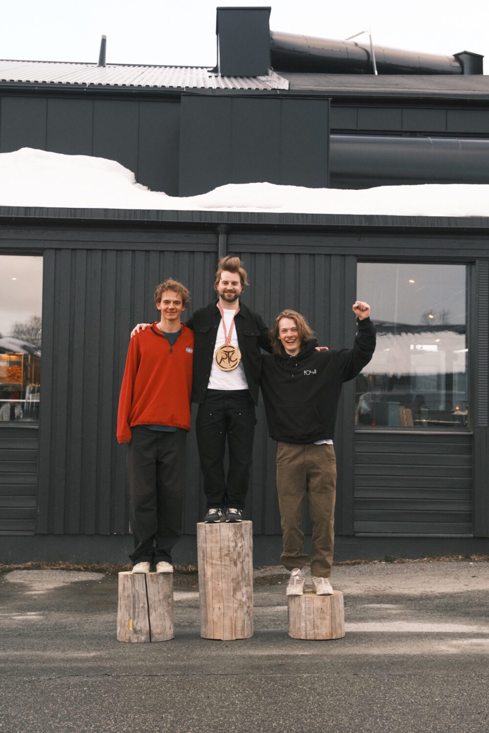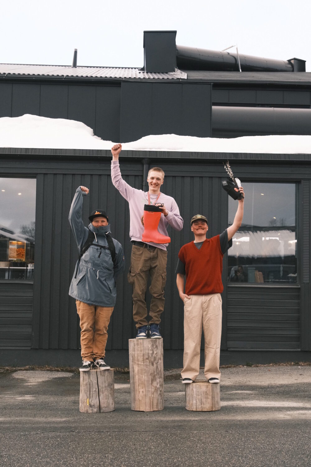 I källaren på Hemavans Fjällcenter lotsar tävlingens speakers Anton Cawthorn och Ella Swan oss genom prisutdelningen. Nordica sponsrar med priser till Årets Nykomling, där Sara Skarin och Kevin Lind vinner varsitt par Nordica Unleashed. Johan Edström är förutom ständig starter, också timmerman och slöjdlärare. Med hjälp av honom har tävlingen ordnat en prispall av stockar och hemmagjorda medaljer till alla vinnare.