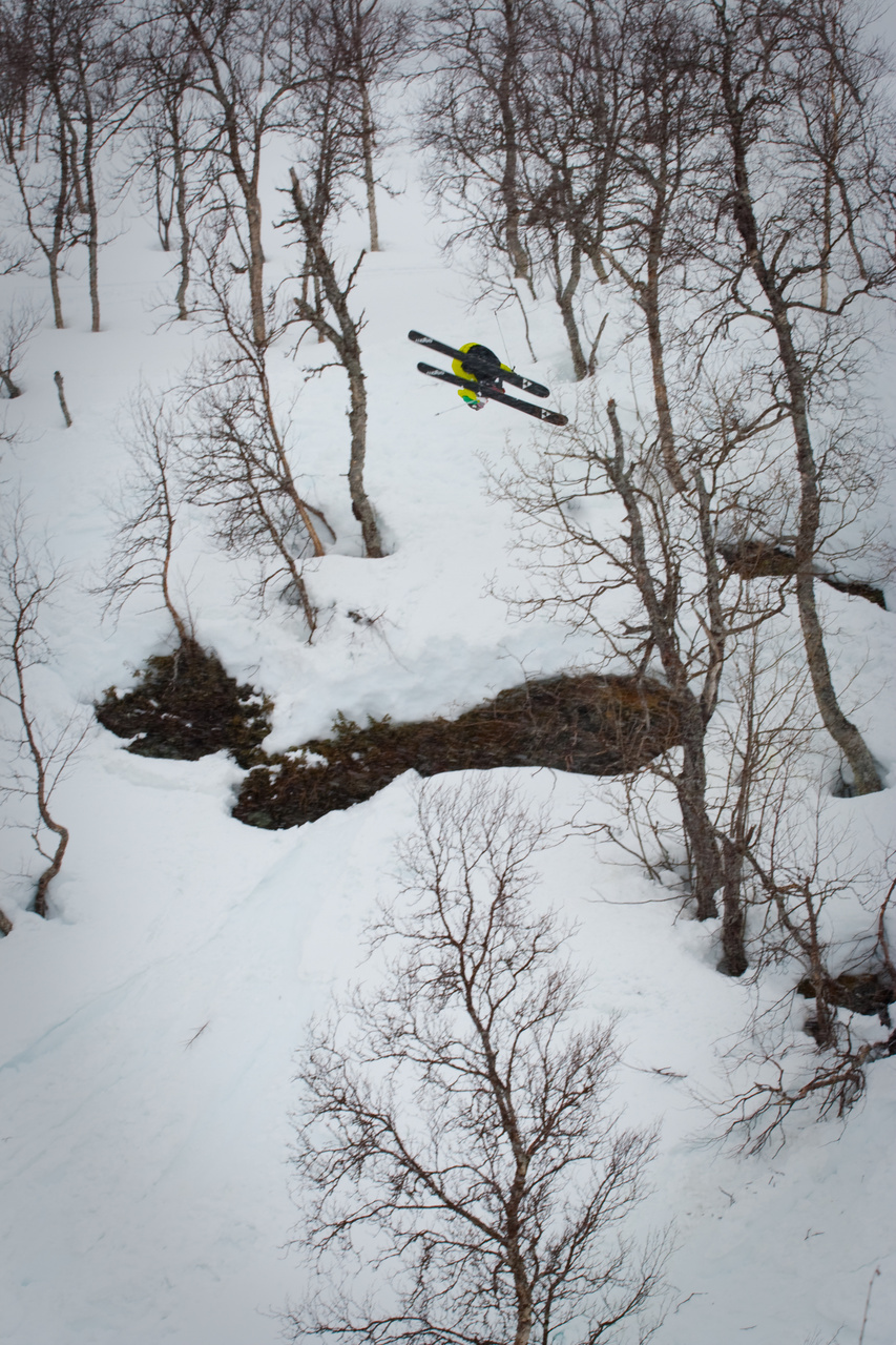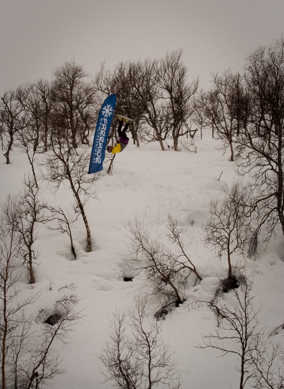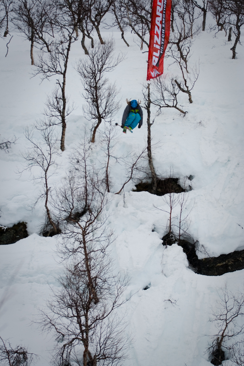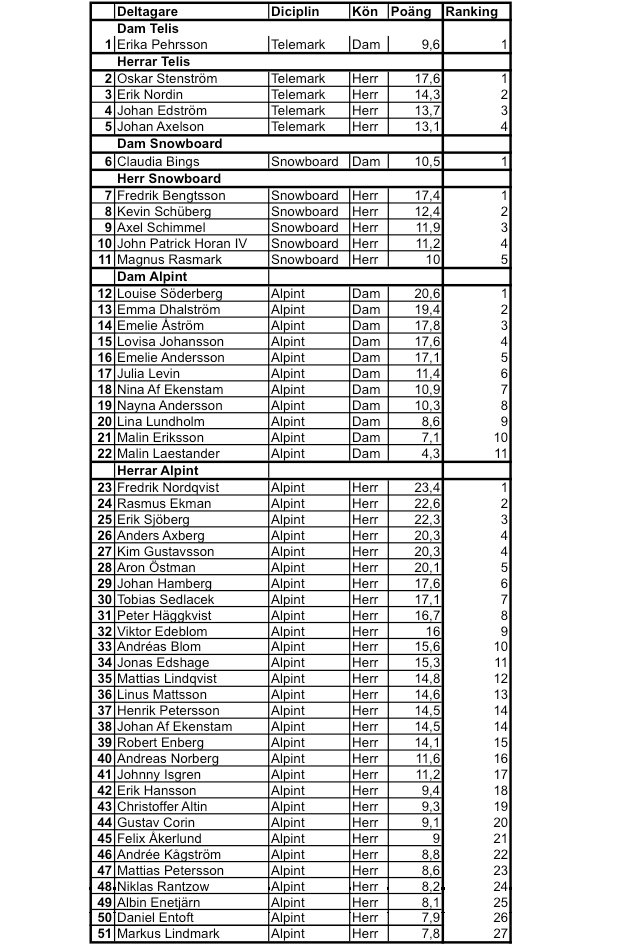 Foto: Lucas Lindh Vinnaren herrarnas alpina klass blev Fredrik Nordqvist som bland annat bjöd på en perfekt backflip ut i bäcken. Det ska även tillägga att med årets sugande snöförhållandet var det en prestation att bara stå på benen. Vinnarna i snowboardklassen blev Fredrik Bengtsson och Claudia Bings. Tävlingen hade även en del tappra telemarkåkare som bjöd upp till dans i Bäckravinen. Vinnarna bland telemarkarna klassen blev Oskar Stenström och Erika Pehrsson.