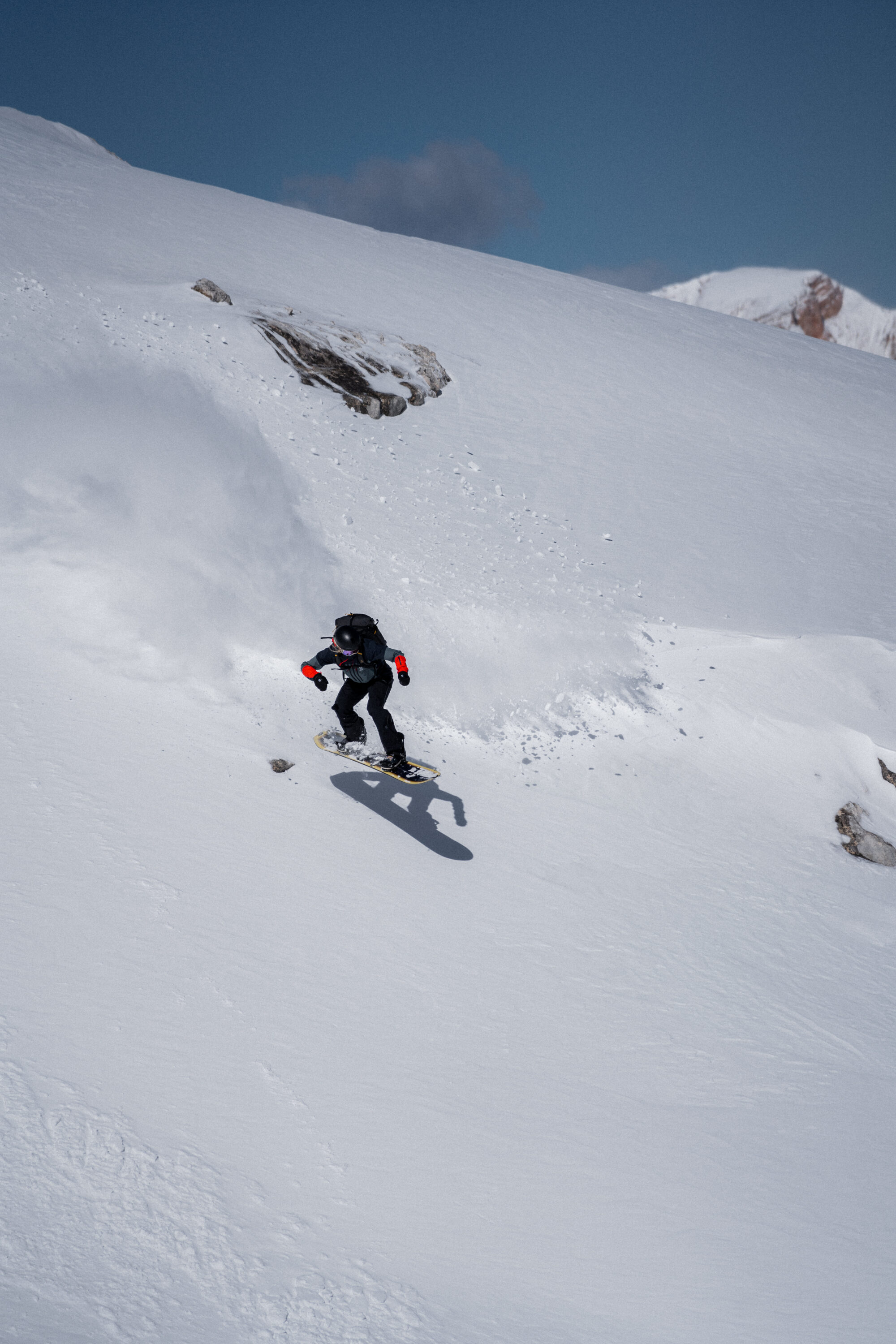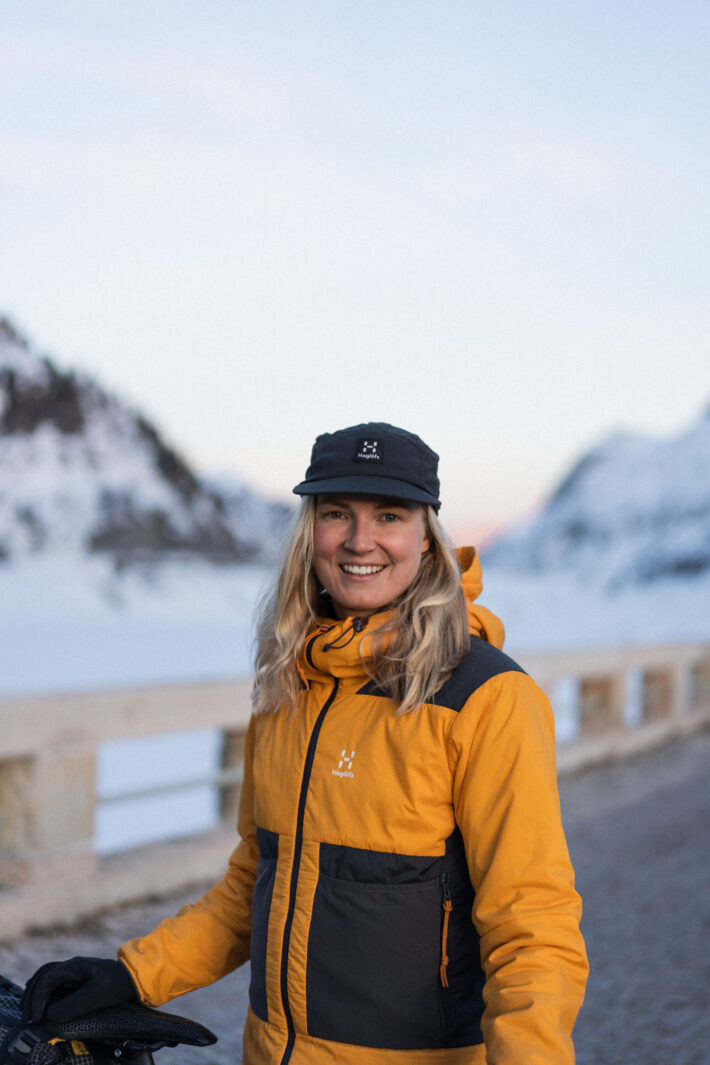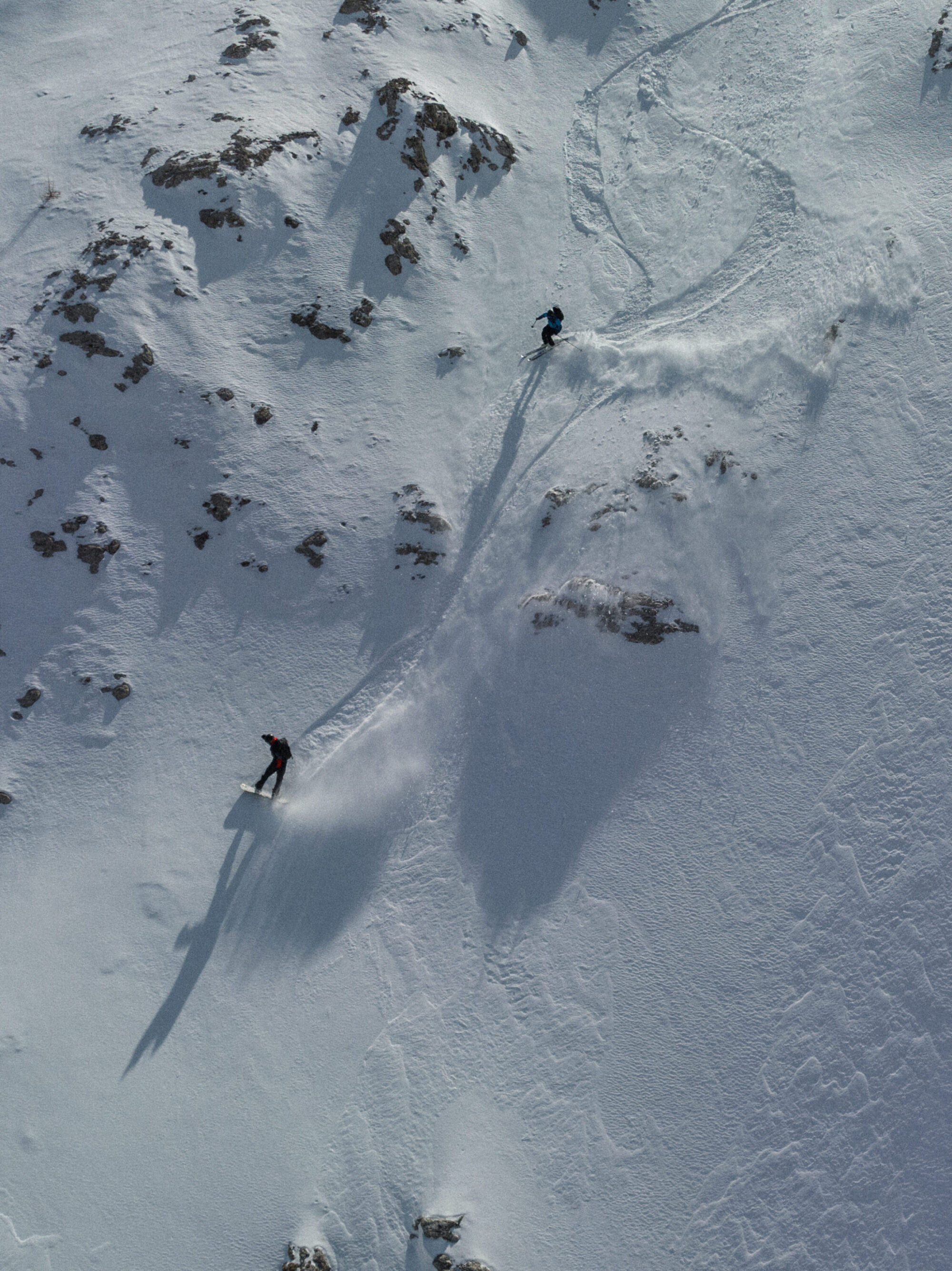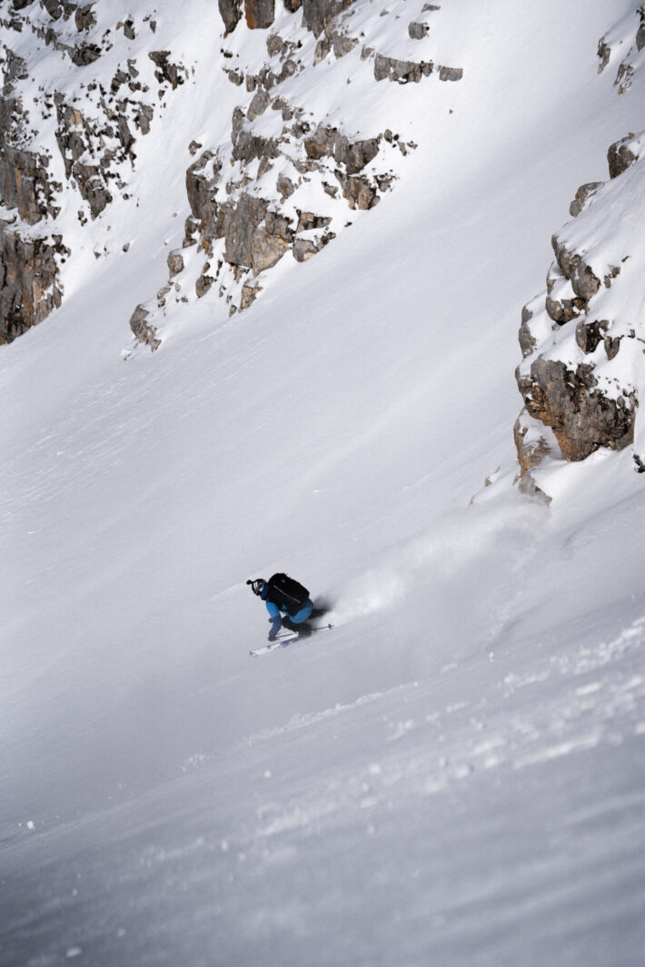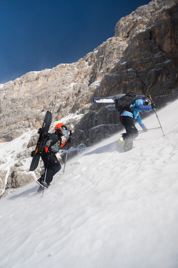 Snön som hade börjat falla efter vår ankomst till stugan hade kommit med för mycket vind för att fastna på de isiga bergen. Kreativitet hade varit nyckeln till att få någon åkning gjord i vinter, att hitta ett sätt att få ut det mesta av de rådande förhållandena oavsett hur dåliga de var. Efter att vi kollat runt i området hittade vi en intressant liten couloir och en bowl som vi bestämde oss för att åka. ”Go girls”, skrev Sami på snön när Malva och Henna tog sig upp till couloiren. Det blåste kyligt, men solen sken på oss där vi åkte.